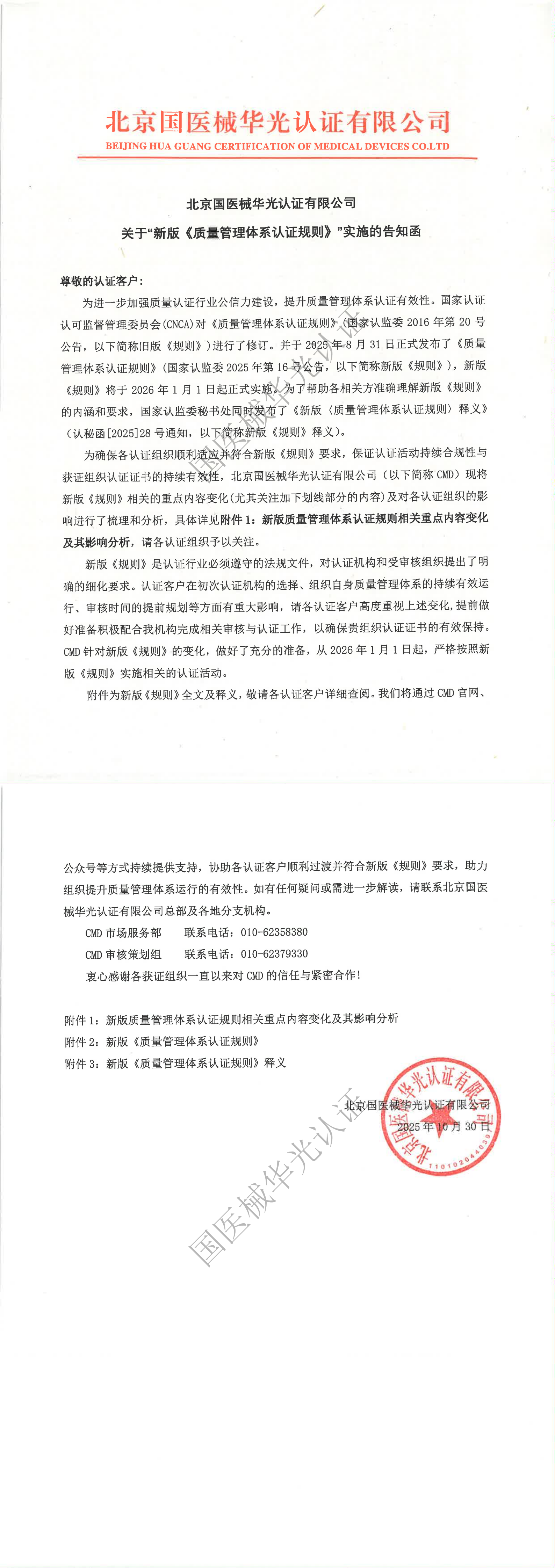 关于“新版《质量管理体系认证规则》”实施的告知函